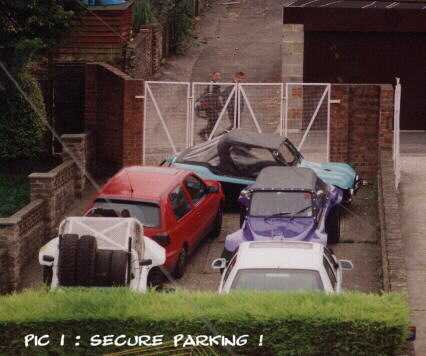 Luckily no one is hurt, although Rachel is suffering from slight shock, and originally it looks like there is, remarkably, no serious damage to the buggy bar a few minor bumps and scrapes. Luckily two Belgium lorry drivers stop and phone the local highway Police. Then Police arrive and, after checking no one is hurt they phone a local garage to come and 'rescue' Rob's buggy. The garage winches purple out of the ditch for us to find that the rear off side swing axle drive shaft is bent The garage then takes us to their workshop to assess the damage and allow time to make a decision on what to do next. At the garage - garage RONNY of Altaar, Belgium, we discover the owner, Ronny, races a Porche 2.4 litre powered grass track beetle. He also has a few scrap beetles out the back with the necessary parts required to repair purple. After 2 to 3 hours of work we decide the work is too much to do if we want to spend any time at the Euro show, as both the engine and gearbox need to be removed on a swing axle. At this point RONNY is absolutely brilliant to us. He allows us to leave purple under cover in his garage for the weekend and agrees to trailer the car back to Ostend docks to meet up with us on the following Monday morning. Finally we pack 6 people and all gear into 1 beach buggy, 1 VW golf and the trailed race car and head for VW Euro. We arrive at the showground around 10:00pm on the evening (just 1 hour before the gates are locked!) and get the last three camping spots on the whole site.