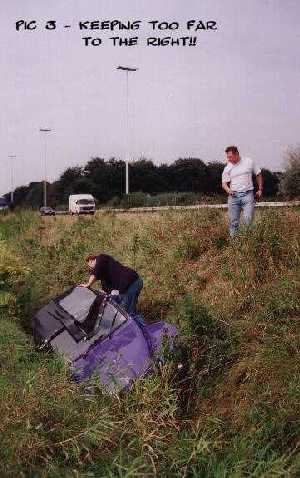20 miles out of Ostend, Rob looses his rear wheel at 70mph!!! He travels across two lanes, the hard shoulder and down a 15 feet 45 degree bank.