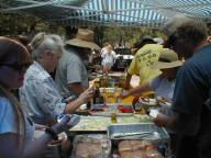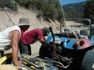 Since we had so many lost buggies on the last trip, we tried a new technique to keep everyone on the same route. We had previously employed the "Golden Rule" (i.e. always wait at each fork in the road until the buggy behind you comes along) but the temptation to keep up with your friends caused impatient drivers to leave early. So our new "Peel & Wait" system was employed. In this technique the first car in line behind the leader is told to wait at the first fork in the road until all the cars have passed. When the designated tail end "pick-up" vehicle comes along, the waiting car can then get back in line. So as we make turns, there is always a buggy waiting at the corner to tell us where to go. Everyone seemed to enjoy this as it is much like a parade passing by with passengers waving and having a good time.