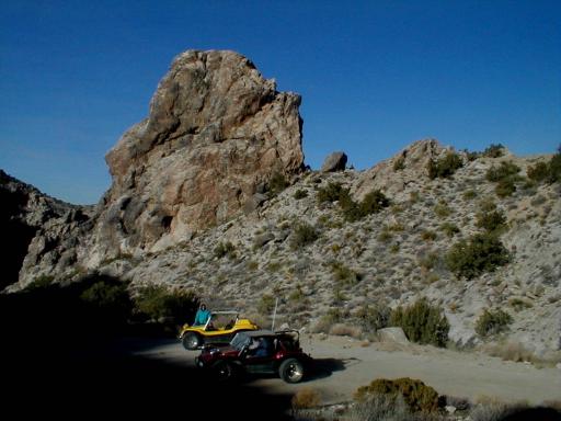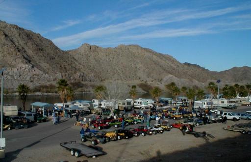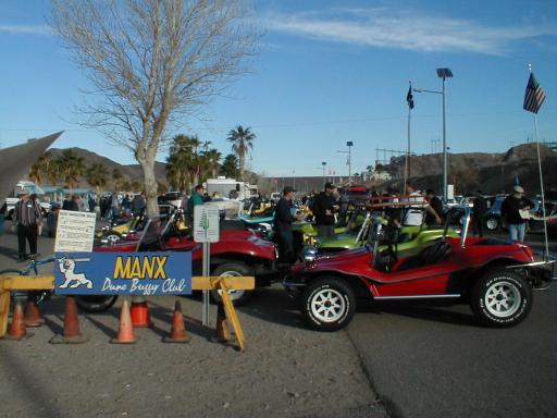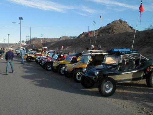 | We camped on the Colorado river just north of Bullhead City. Local buggy builder Marc Frederick (member #900 above) was kind enough to be our guide again this year. We split into three groups to enjoy either the "difficult", "medium", or the "Posey Sniffer" trails. Marc led the "difficult" capability group out on the trial the first day for some hill climbing, rock climbing, and then lunch in Oatman. |