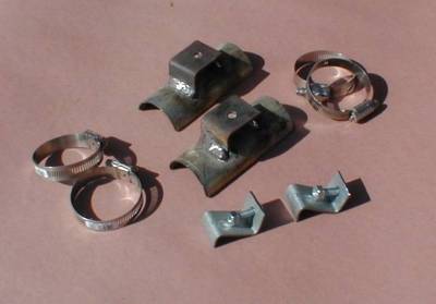 The rear structural mounting point for the rack is the top of the roll bar. I did not want to drill any holes in the roll bar so I took Bruce Meyers advice and built two saddle brackets. These brackets are made from a piece of 2" I.D. galvanized steel pipe 5" long that has been cut lengthwise. These half round pieces of pipe then "adjusted" with a hammer so that they sit snugly on the roll bar. Each half round piece of pipe must then have a piece of 1/8" x 1-1/2" steel strap welded on the top. The steel strap is 4" long with a hole in the center for a 5/16" bolt to connect to the aluminum pan. At one inch from each end the strap is bent up 90 degrees to form a "U" shape. The ends of the "U" bracket are then ground to fit on the 2" pipe and welded in place. These steel saddles are then held on the roll bar with hose clamps with a piece of sheet rubber in between to prevent scratches if you have chrome. These steel saddles are extremely strong and will not move if a hose clamp is placed on each side of the saddle.