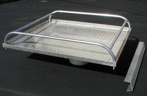 The rack I designed is made of aluminum diamond plate that is light and strong. The polished surface on the diamond plate is attractive and will take a lot of abuse. The diamond plate is formed into a 1-1/2 inch deep pan and steel tubing is bent and welded together to from the rest of the rack structure. Another piece of diamond plate is used support the rack above the buggy windshield.