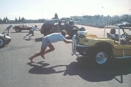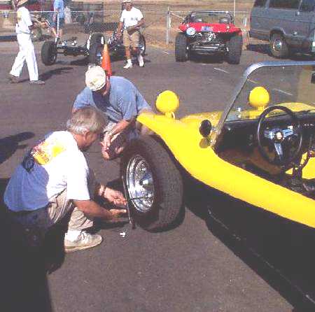 The "fun" events after the rally included: a "Blind Driver Slalom", a "Push Drag" , a timed Tire Change, a "Piston Toss", and a "Guess the Parts in the Box" game. Each of the events added time or points to our score for the rallye. The "Blind Driver Slalom" required a blindfolded driver to drive through a series of gates (two rubber cones) in the parade ground area with verbal directions from his navigator. The "Push Drag" was an elimination race (pushing only - i.e. no engines) over a 20 yard course.