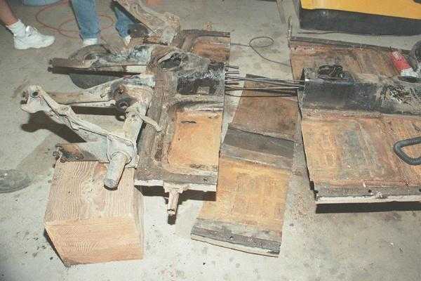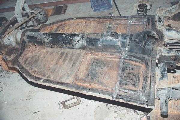 Once the top of the tunnel has been removed, put supports under the middle of the car and cut the sections out of the sheet metal floor.