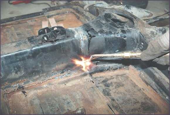 When shortening the pan it is extremely important to correctly weld the tunnel back together to restore the structural integrity of the frame. When a fiberglass body is bolted to the frame it regains some of the "monocoque" characteristics but it is not nearly as rigid as the original VW Bug. If the tunnel is not correctly welded and strengthened, the car is very likely to break in half. A MIG wire-feed welder is recommended for the welding; however, I have done the job by steel brazing with oxygen-acetylene gas. An arc welder is not recommended because the material is so thin that an arc welder will just melt holes in the metal. It is also very important to keep the alignment of the frame intact. I always spend more time measuring for accurate alignment than I spend welding.