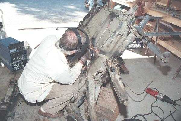 Once the halves are tightly together and aligned, the welding process can begin. Tack weld the top center of the tunnel and then the straight sections of the tunnel sides where they are evenly matched. Now use an oxygen-acetylene torch to heat the mismatched sections and beat them into place with a hammer. Alternate between welding and heating with the torch until the tunnel is completely welded on the top side. There may be up to 1/2" gap where the two floors meet at the bottom edge of the tunnel. This will require some extra heat and a 5 pound hammer to get the edges close enough to weld. Now turn the chassis over and weld the bottom edge of the tunnel together.