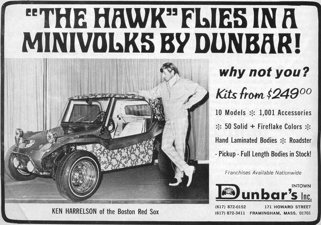 The 1969 MiniVolks ad from Dunbar's Inc. in Framingham, Mass. that Warner included is great! Ken ("The Hawk") Harrelson, the famous-in-some-circles Chicago White Sox broadcaster looks a bit younger 30 years ago than he does now! (Don't we all though!)